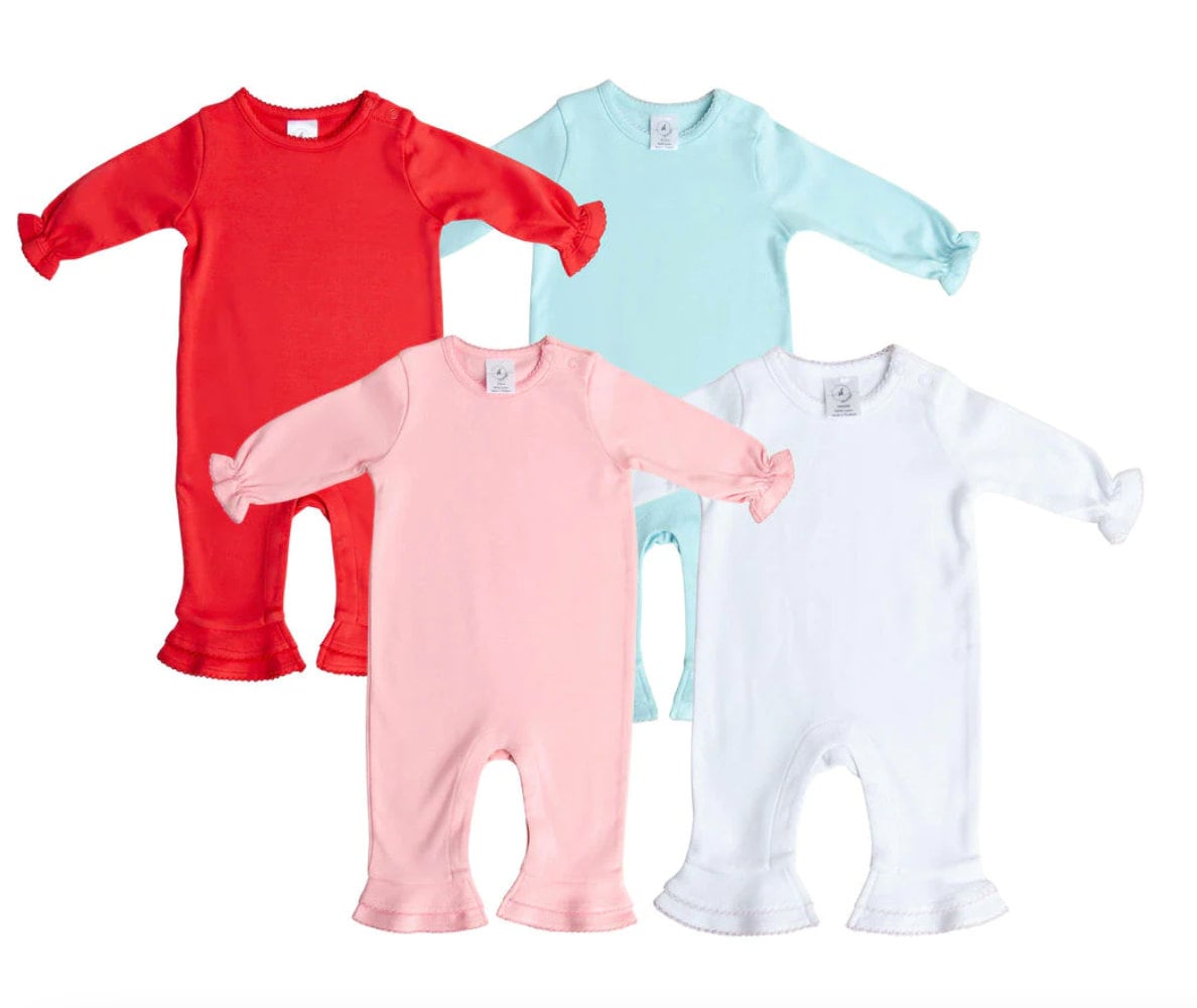 This mint romper is perfect Christmas outfit for the littles. It is 100% cotton, runs TTS, and snaps at neck and legs. This romper has ruffle legs and ruffles at the wrists.